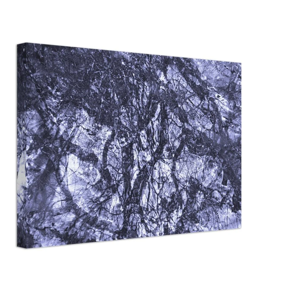 An abstract composition of branching lines and layered indigo tones of winter branches and petrified mineral surfaces.
